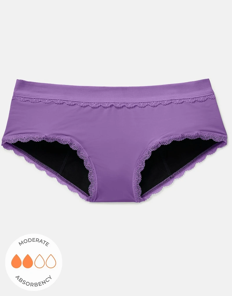 These hipster-style panties are perfect for your medium-flow days or for everyday wear. The dark purple panties are made with stretchy and soft micro-fiber fabric, and have a leak-proof layer for extra protection. (Available in sizes XS-4X)