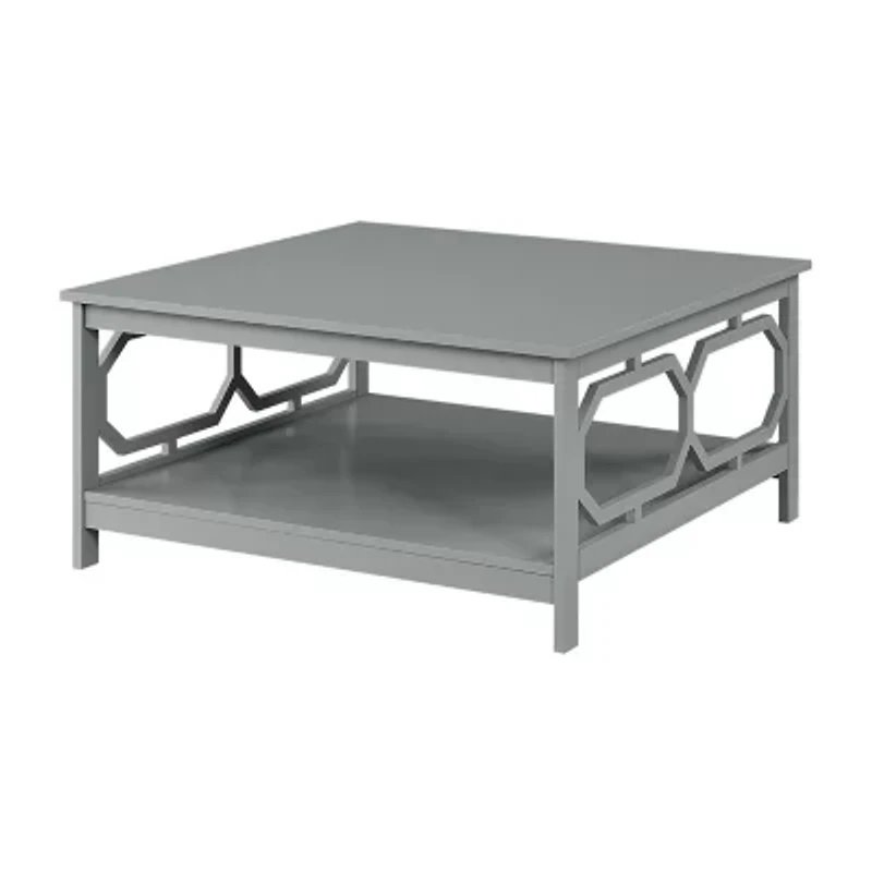 Reinvent your living room with the omega square 36 inch coffee table with shelf. The simple yet eye catching design showcases clean lines and beautiful octagon cut outs on the sides. Available in multiple finishes it is sure to complement any home decor. Featuring a large tabletop surface and a lower shelf that provides usable display space. Engineered for durability this piece will become a staple in your home. Look for other items from the omega collection for the complete look sold separately.