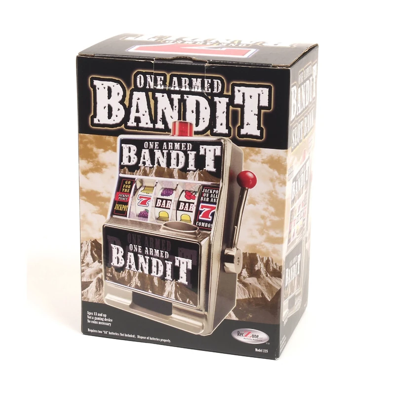 Now you can bring the excitement of a casino slot machine to your very own home! This miniature size slot machine works and functions just like the real ones in the casinos. Simply place coins inside and pull the lever to try to get the jackpot! Once a jackpot is won, the bells sound and the light on top flashes, making the experience that much more exciting! 8" tall with working handle, manual coin return, ringing bell, and flashing jackpot candle. Jackpot payout. Requires 2 AA batteries to operate bell & candle (not included).Contents include: Slot Bank, Instructions. Requires 2 AA batteries (not included).For 1 playerAges 13 and upMade in ChinaBrand new condition in original packagingWipe clean with dry or damp cloth