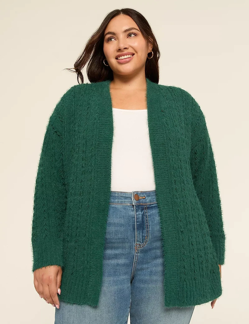 Available in Plus Size Every stitch tells a story - and in this cardi's case, it weaves together a soft-textured tale of layering potential. FIT: Classic. Designed for curves and a not-too-tight, not-too-loose, just-right fit. Front Length (On Body): 33" Longer length is perfect for added coverage FEATURES: Open front Long drop shoulder sleeves Ribbed trim FABRIC: Soft-textured sweater knit with the perfect amount of stretch TURN INSIDE OUT, MACHINE WASH COLD WITH LIKE COLORS, GENTLE CYCLE,ONLY NON-CHLORINE BLEACH WHEN NEEDED, TUMBLE DRY LOW, COOL IRON IFNEEDED. 63% POLYESTER 22% NYLON 15% RAYON Item Number #413233 Imported Plus Size Top ". Plus Size Open-Front Stitch Cardigan, in Dark Green, 10/12, Women's, Lane Bryant