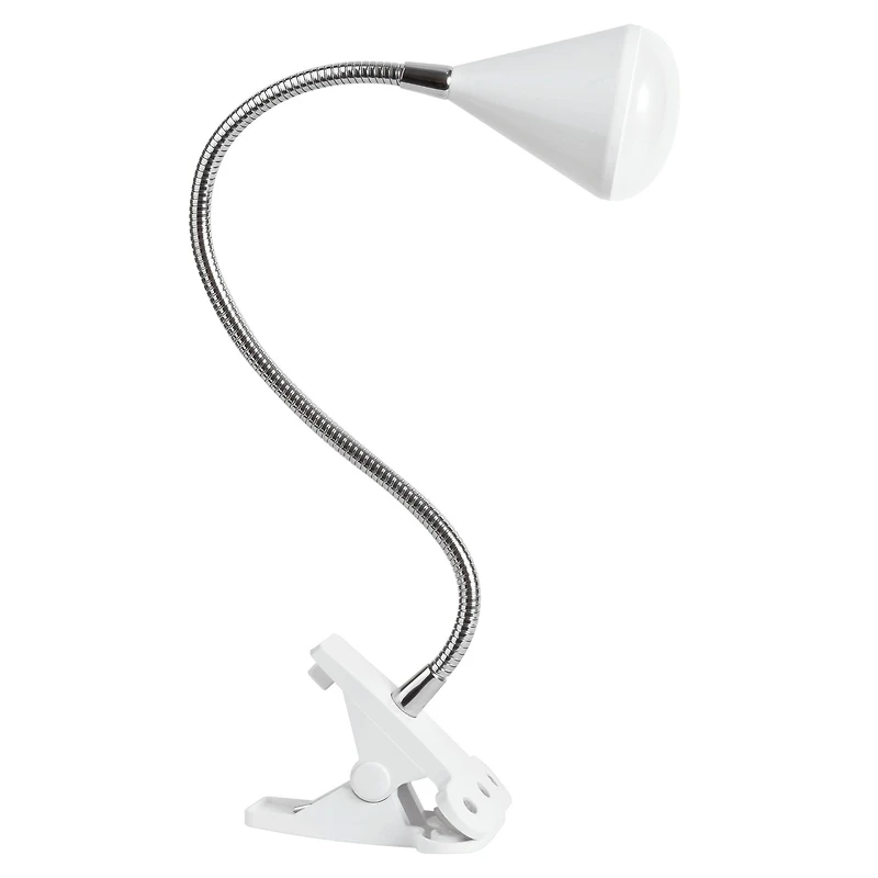 The flexible LED cone clip lamp allows you to position LED Illumination at nearly any angle and easily attaches to your craft table, desk or anywhere you have electrical power. The stylish design fits any décor. You’ll see every color accurately and detail clearly with reduced glare and eyestrain.Details: White4" x 4" x 18.25"Maximum of 320 lumensPerfect for small areas