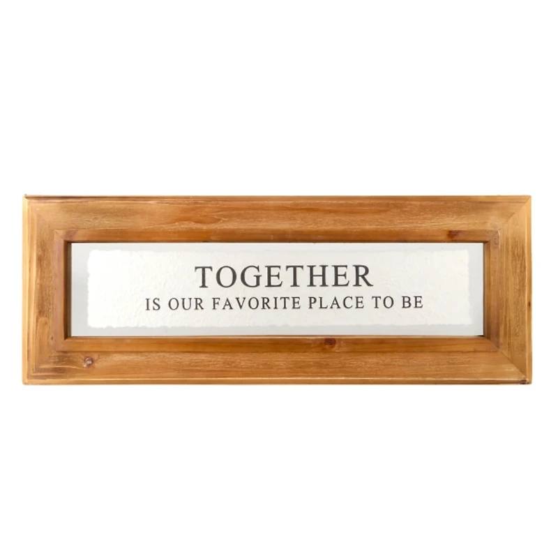 This Our Favorite Place to Be Wall Plaque will fill your space with a welcoming warmth. Its touching phrase is a beautiful reminder of what is most important! Overall dimensions Width: 31.9 in. Depth: 1.2 in. Height: 11.8 in. Crafted of wood Natural finish White background finish Features the phrase "Together is our favorite place to be" in black letters Hangs from back-mounted hardware Care: Dust with a soft, dry cloth. Contact your local Kirkland's store for availability. Quantities and selection may vary by location. WARNING: Cancer and Reproductive Harm - For more information go to www.P65Warnings.ca.gov .