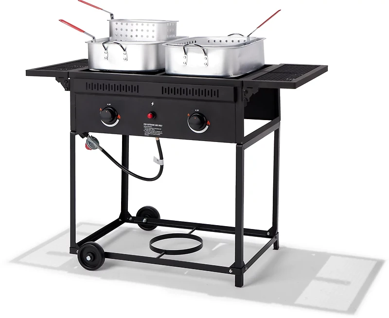 Fry up a delicious meal with the Outdoor Gourmet Fish Fry Cart. The cast iron burners with aluminum pots and baskets afford durability, while the 100,000 BTU output efficiently cooks your food. The electronic ignition ensures ease-of-use, and the wheels offer convenient portability.
