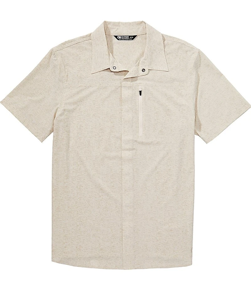 From Outdoor Research, this shirt features: Spread collar Short sleeves Button-front closure Zip pocket at left chest Breathable, lightweight fabric Quick-drying Stretch UPF 30 Moisture-wicking Nylon/spandex Machine wash/tumble dry Imported.