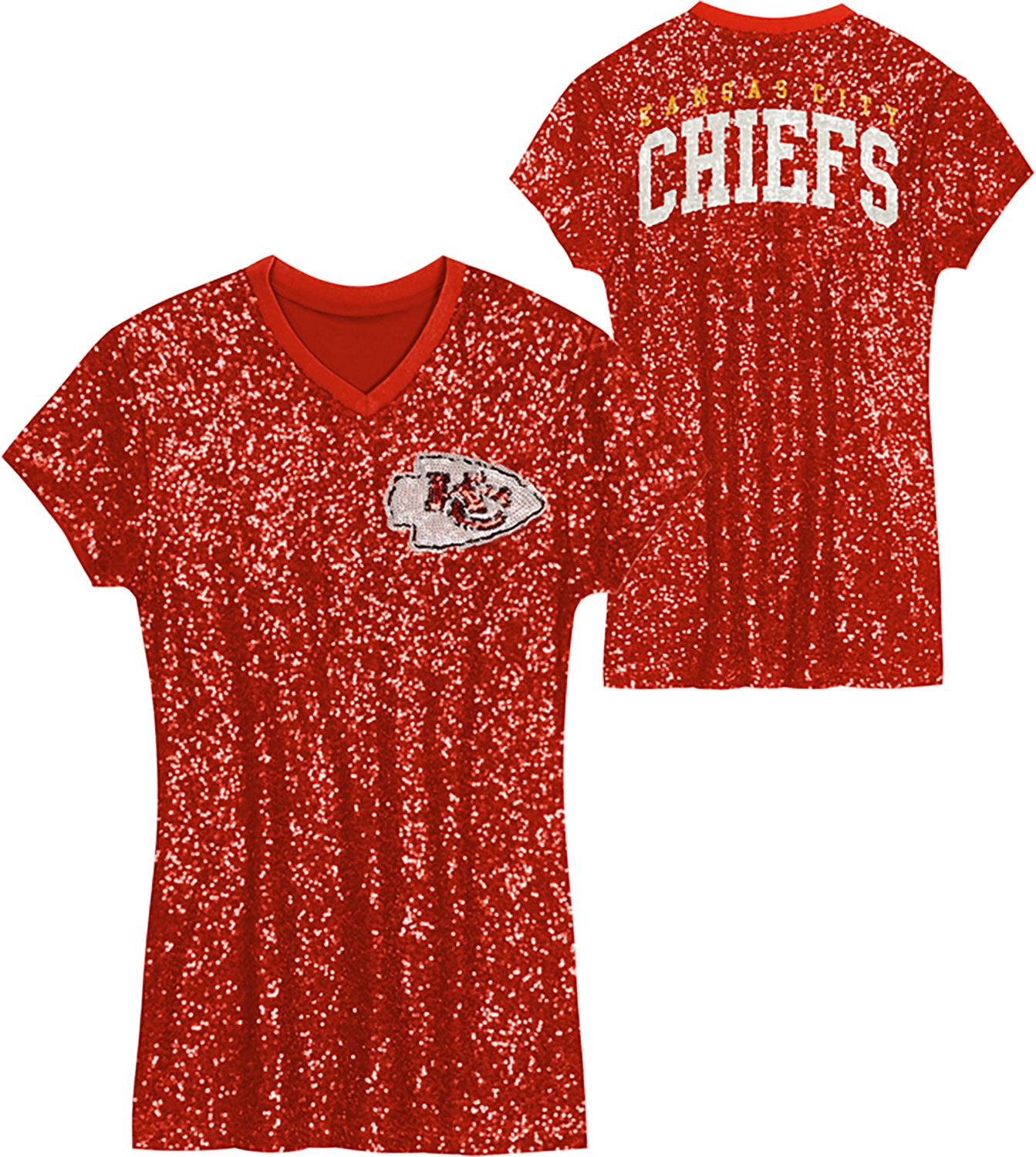 Shine bright on game day with the Outerstuff Women's Kansas CIty Chiefs Wordmark Sequin Dress. Designed with a sleek V-neck and multi-colored sequins, this dress delivers a statement look that symbolizes your unwavering support for the team. Logos on the front and back let you proudly represent the Kansas City Chiefs, while the short sleeves ensure you stay comfortable throughout the day. Perfect for cheering from the stands or celebrating with fellow fans.