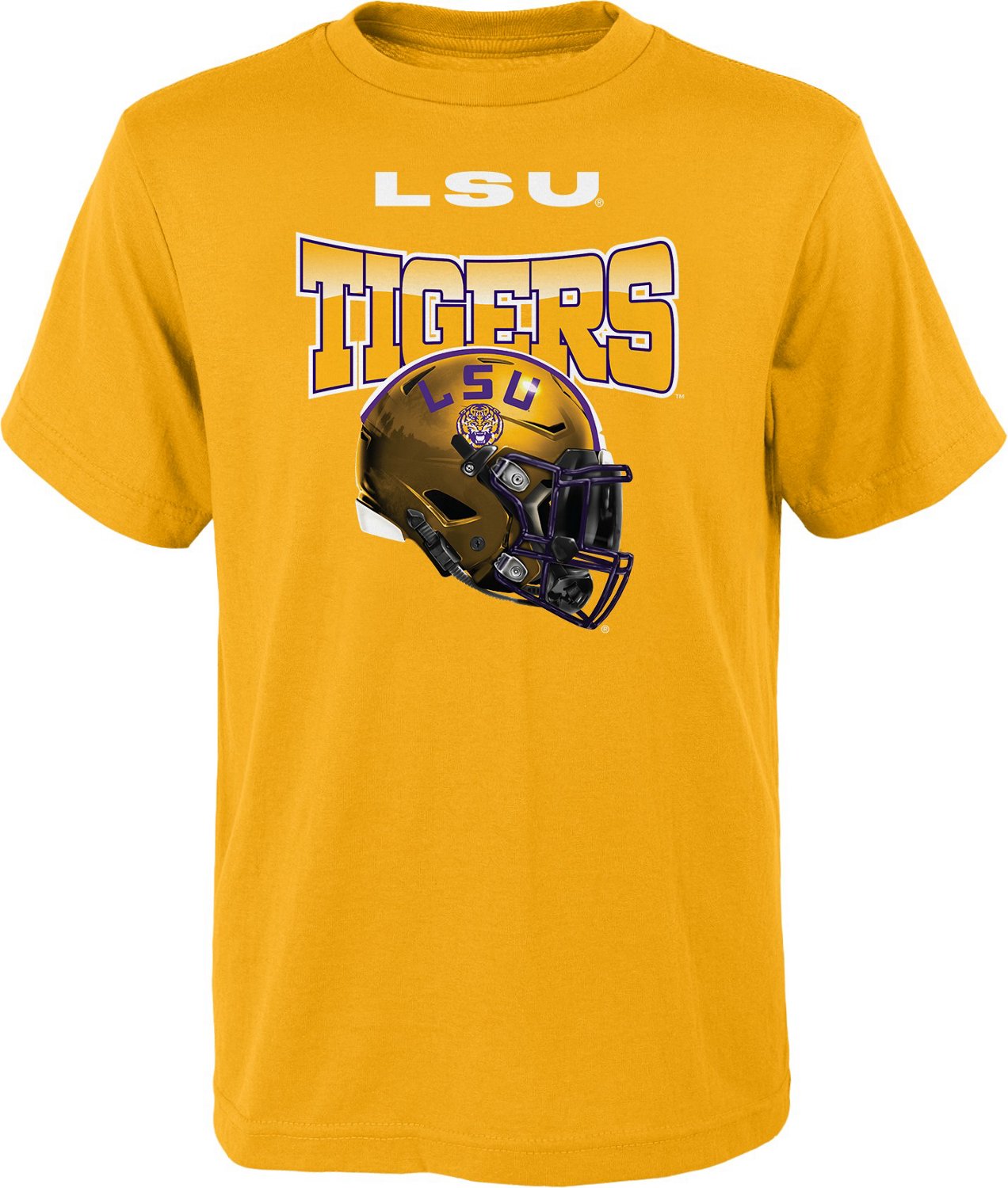 His fan status will be on full display with the Outerstuff Youth Louisiana State University Heads Up T-shirt. Made from 100% 30s cotton jersey, this shirt is designed for comfort. Screen-printed LSU Tigers football helmet graphics on the front show his support. Short sleeves.