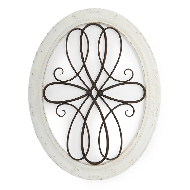 This Oval Evangeline Wood and Metal Wall Plaque adds stunning dimension to any wall. Its classic elegance will put the perfect finishing touch on your space! Overall dimensions Width: 19.5 in. Depth: 1.25 in. Height: 25.5 in. Crafted of wood and metal White frame finish Black metal finish Features a decorative metal design Oval shape Weight: 3.75 lbs. Hangs from back-mounted hardware Care: Dust with a soft, dry cloth. Contact your local Kirkland’s store for availability. Quantities and selection may vary by location. WARNING: Cancer and Reproductive Harm - For more information go to www.P65Warnings.ca.gov .