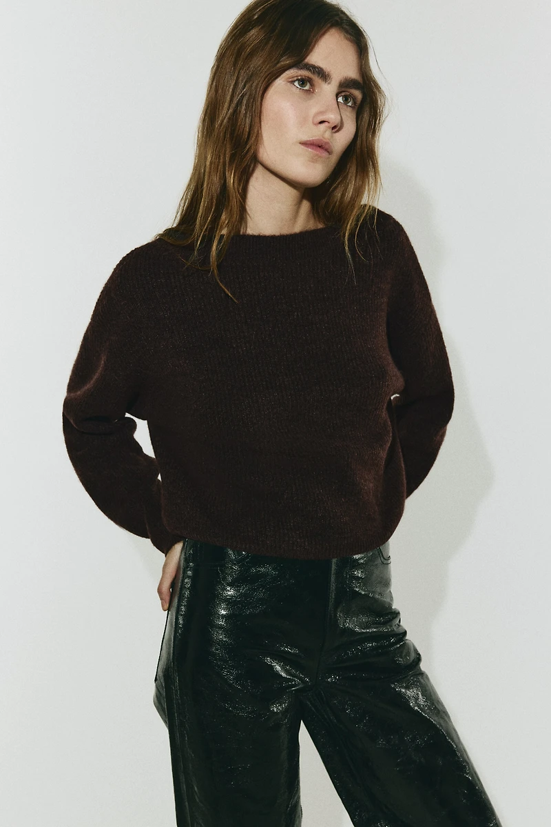 Oversized sweater in a soft rib knit. Boat neck, dropped shoulders, and long sleeves. Ribbing at neckline, cuffs, and hem.