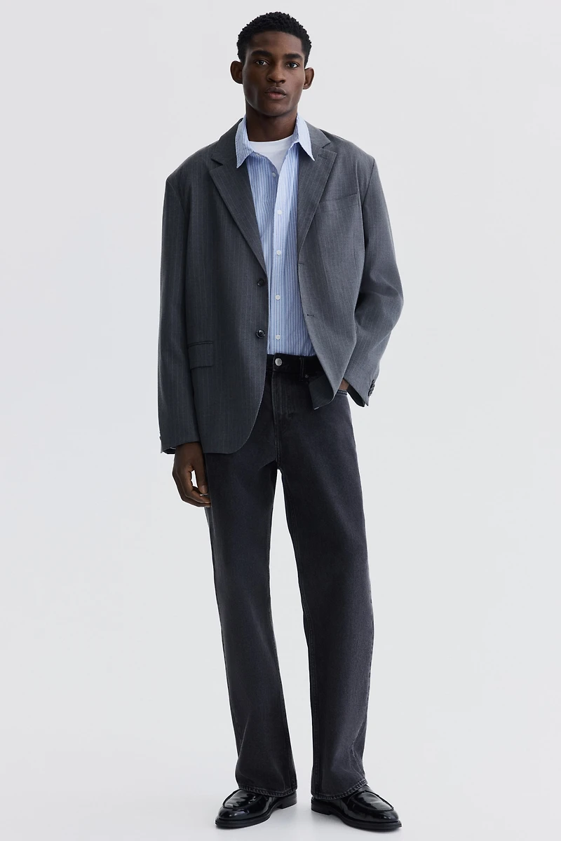 Oversized, single-breasted jacket in soft woven fabric with an extra-loose silhouette. Notched lapels with a decorative buttonhole, two buttons at front, and decorative buttons at cuffs. Welt chest pocket, front pockets with flap, and two inner pockets. Double vent at back. Lined.