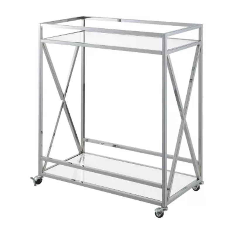 Entertain in style with the trendy oxford chrome glass bar cart with shelf by convenience concepts. Easily add elegance to any room thanks to the sleek chrome metal frame, beautiful clean lines, and x-shaped side panels. Hosting a gathering is easy with this mobile cart offering ample space to pour and keep beverages nearby. Each tier of shelving is made of removable clear tempered glass allowing for easy cleanup and maintenance. Roll this portable storage cart from room to room thanks to the 360-degree swivel caster wheels. Two of the four wheels have locks to safely secure your beverages in place. This contemporary piece can also be used as a decorative hall table or even a bathroom storage cart, versatility is endless. Coordinate this glam cart with matching pieces from the oxford chrome collection by convenience concepts, each sold separately.