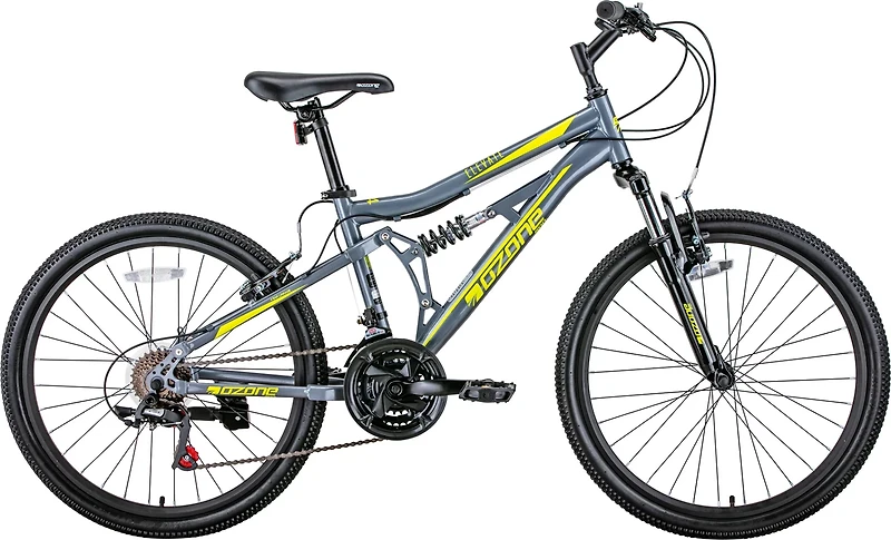 Go for a ride on the Ozone 500 Girls' Elevate 24 in Mountain Bike. The steel dual suspension frame affords durability, while the 24-inch diamond tires with alloy double rims deliver a smooth ride. The steel V-brakes ensure reliable stopping, and the Sunrun 21-speed derailleur for fast shifting.
