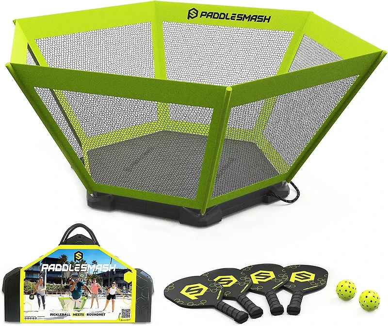 The PaddleSmash Outdoor Game combines the best elements of pickleball and roundnet into a fun and easy-to-learn game. The net is the perfect size for hitting balls into to score, and the four paddles let you and three of your friends compete together. The two balls remain resilient outdoors, and the foldable net can be laid out easily on grass, sand and more.