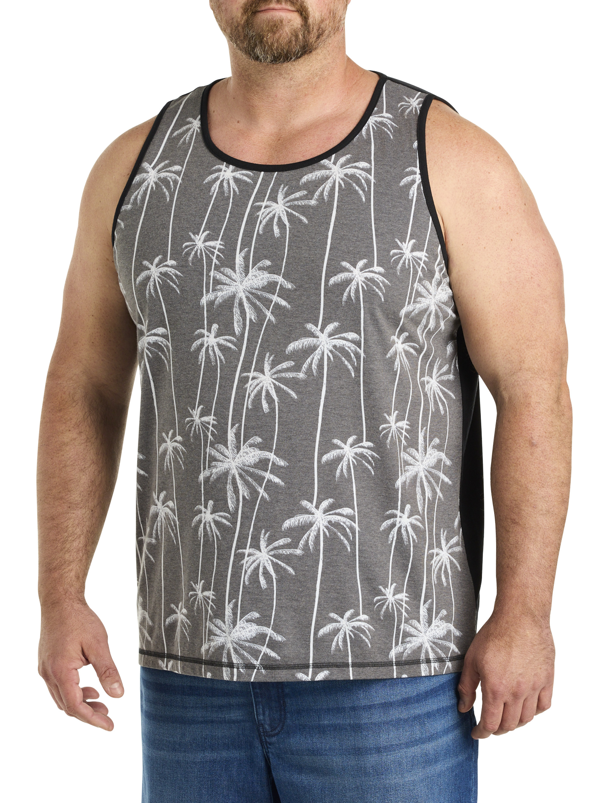 With its allover palm tree pattern on the front side and a solid back side, this sleeveless, tank-style tee is giving us all the vacation vibes. Designed right here at DXL with precise proportions and an ideal fit for Big and Tall guys, it's crafted from a lightweight fabric blend that allows for the freedom to move without restriction. Paired with shorts, joggers, swim trunks and more, it's a must-have, warm-weather staple.