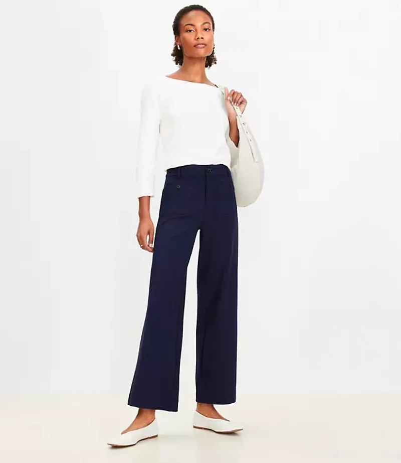 Pants Details: Front zip with button closure. Belt loops Front button patch pockets. Back welt pockets., Leg Shape: Palmer Wide Leg - fitted through the hip, relaxed through the leg, Rise: Sits at high waist, 10 3/4"rise, Imported:, Fit: Polished yet casual, with fresh front patch pockets, Length: Ankle length, 28"inseam, Fabrication: 66% Rayon 29 Nylon 5 Spandex, Garment Care: Machine Washable Loft Palmer Wide Leg Ankle Pants in Ponte Size 12 Deep Space Blue Women's by Loft Size Regular - 12 Deep Space Blue Women's Regular, Wide Leg Pants 66% Rayon 29% Nylon 5% Spandex Machine Washable
