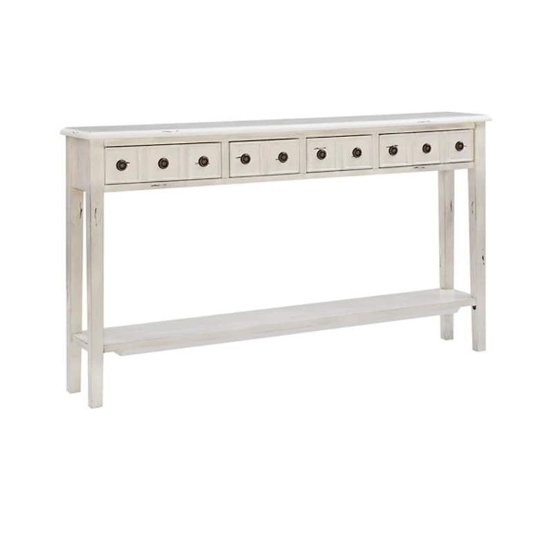 You’ll love the well-worn style of our Paloma Cream 4-Drawer Console Table! Antique bronze and distressed cream come together here with a stunning effect. Its slender size makes it ideal for hallways and entryways. Table measures 60L x 10W x 35H in. Crafted of wood, wood composite, and metal Distressed cream finish with a dark glaze Features two (2) large drawers, two (2) small drawers, and one (1) lower shelf for storage Tapered leg design Antique bronze pull hardware with floral medallion details Top weight capacity: 100 lbs. Shelf weight capacity: 50 lbs. Assembly required Not intended for commercial use Care: Dust with a soft, dry cloth. This item is available at Kirklands.com only, not available in stores. Please note: this item cannot be shipped to APO/FPO addresses. WARNING: This product can expose you to chemicals including DI-(2-ethyl hexyl) phthalate, which is known to the state of California to cause cancer and birth defects or other reproductive harm. For more information go to www.P65Warnings.ca.gov/furniture