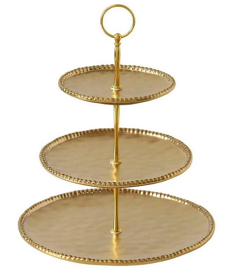 From the Monte Carlo by Pampa Bay, this 3 Tier Stand features: Whether displaying pastries, tea sandwiches or desserts, this tiered porcelain stand is a tasteful way to serve guests. Crafted in a luxurious matte gold-toned high-fired porcelain with gold beads. Porcelain Luxurious matte gold-toned Gold beads on trim Perfect for serving pastries Tarnish and stain-free resistant Dishwasher and freezer safe Oven safe to 500°F Measures 11.5 × 11.5 × 13.5" Made in USA.