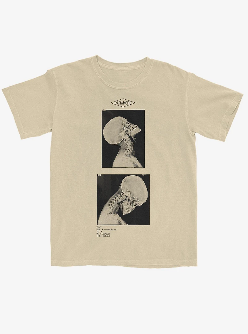 If you love Paramore, you know a thing or two about head banging. The front of this tee shows an X-ray of Hayley William's head and neck. The back has text reading: "On doctor's orders -- excessive head-banging may lead to spinal fracture." Please note: Style runs large; size down for a tighter fit.