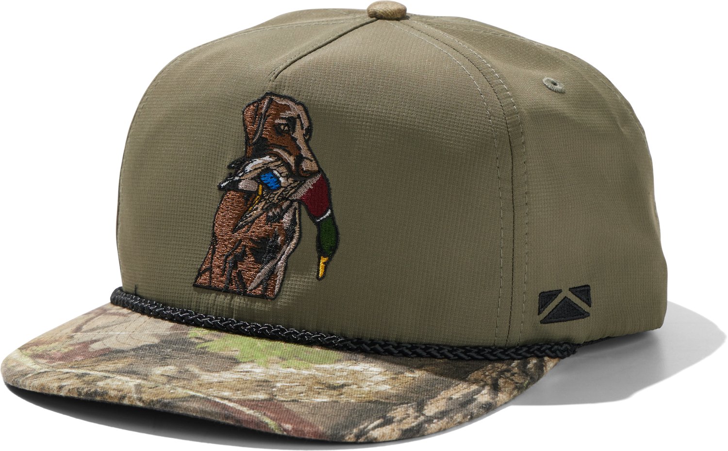 Show your love of dogs, waterfowl and Mother Nature wearing this Paramount Apparel Men's Cap, featuring a 5-panel structured front with a rope, slightly curved visor and lab-with-duck design for eye-catching style. Its micro ripstop performance fabric stands up to damage and dries quickly, providing long-lasting wear while keeping your head moisture-free.