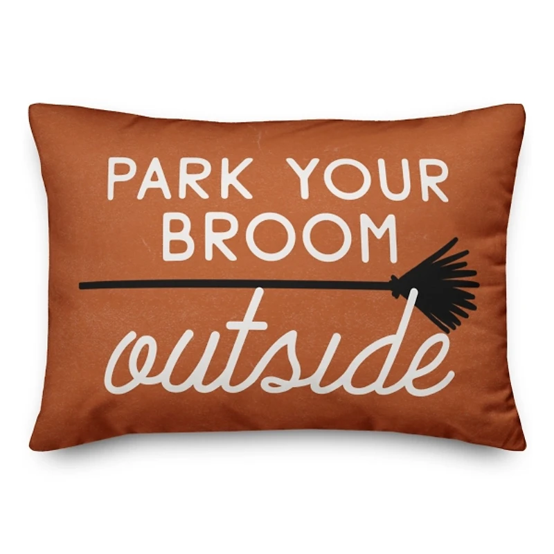 Summon your coven with this Park Your Broom Outside Halloween Pillow. You’ll love the hues of orange, black, and white and the fun broom silhouette. Pillow measures 20L x 14H in. Crafted of treated spun polyester with polyester fill Features "Park your broom outside" A broom is in the middle of the text Hues of orange, white, and black Stain, mildew, and water resistant Safe for outdoor use Designed and printed in the U.S.A. Care: Spot and dry clean only. This item is available at Kirklands.com only, not available in stores. Please note: this item cannot be shipped to APO/FPO addresses.