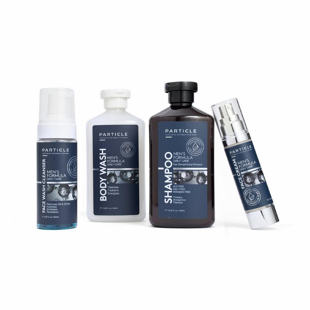 Particle Gift Bundle For Men. Benefits: Complete mens grooming kit.. Face Cream: Anti-aging, hydrates, smooths.. Face Wash: Cleanses, exfoliates, refreshes.. Shampoo: Thickens hair, strengthens roots.. Body Wash: Deep cleans, energizes, fresh scent.. : :