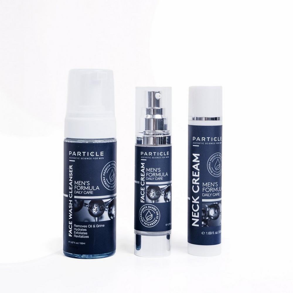 Particle Starter Bundle For Men. Benefits: Elevate your daily grooming with a streamlined trio designed for visible, youthful improvement.. Face Cream Firms skin, smooths fine lines, and boosts youthfulness with powerful anti-aging ingredients.. Neck Cream Tightens and tones, reducing sagging and wrinkles with collagen, hyaluronic acid, and retinol for a defined jawline.. Face Wash Cleans deeply by removing dirt, oil, and grime while gently exfoliating and hydrating for a refreshed complexion.. : :