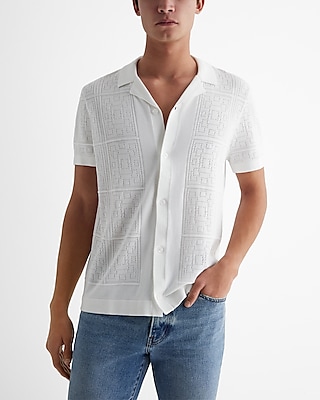 This button through sweater polo features a patchwork pointelle pattern for subtle visual interest. Complete with a trendy camp collar, this sweater is the perfect choice for nights out or days spent around town. Pair with jeans or chinos to complete the look.