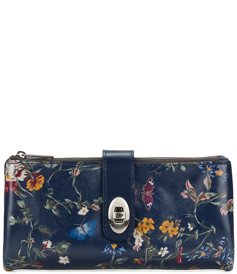 From Patricia Nash, this wallet features: 100% full-grain leather Interior: 3 bill pockets, 1 zip pocket, 12 credit card slots, 1 clear ID window, leather trim, nylon lining Exterior: 1 rear zip pocket, deep embossed grape leaf floret logo, burned edge finish Twist-lock closure Signature brushed nickel hardware, heavy handcrafted stitching Approx. 7.88" x 4" H x 1" W Approx. 6'' wristlet strap drop RFID-blocking protection Imported.