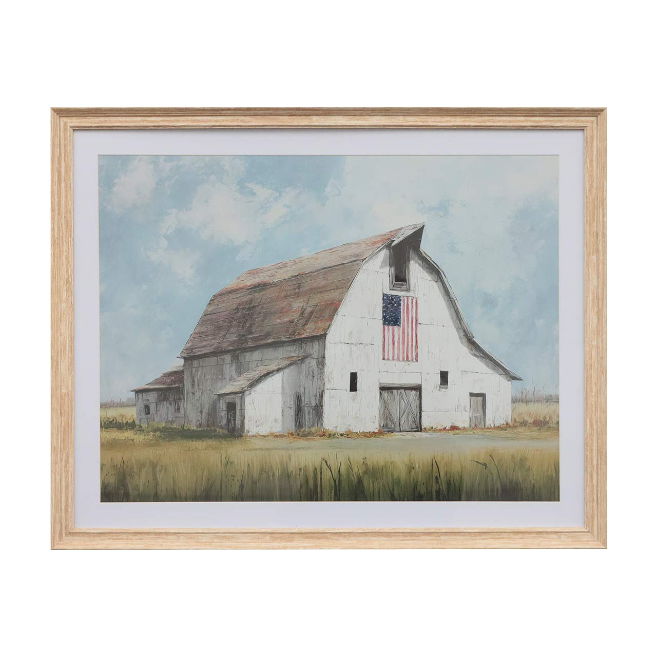 The artwork features a charming, weathered barn adorned with a proudly displayed American flag, symbolizing the timeless spirit of patriotism and the heartland's enduring charm. The barn's rustic white exterior, combined with its faded, earthy roof, stands against a serene countryside backdrop, capturing the essence of a peaceful, sunlit day.