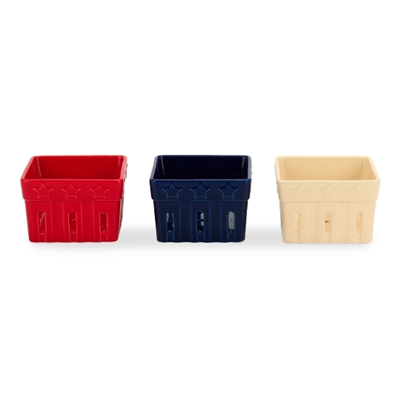 Bring a patriotic flair to your kitchen with these Patriotic Ceramic Berry Bowls. They're perfect for serving up fresh fruit at 4th of July festivities! Sold individually in store Each bowl measures 4.45L x 4.45W x 2.95H in. Crafted of stoneware Berry bowl design Embossed star accents Available in red, white, and blue finishes Food safe Care: Dishwasher and microwave safe. Contact your local Kirkland's store for availability. Quantities and selection may vary by location.