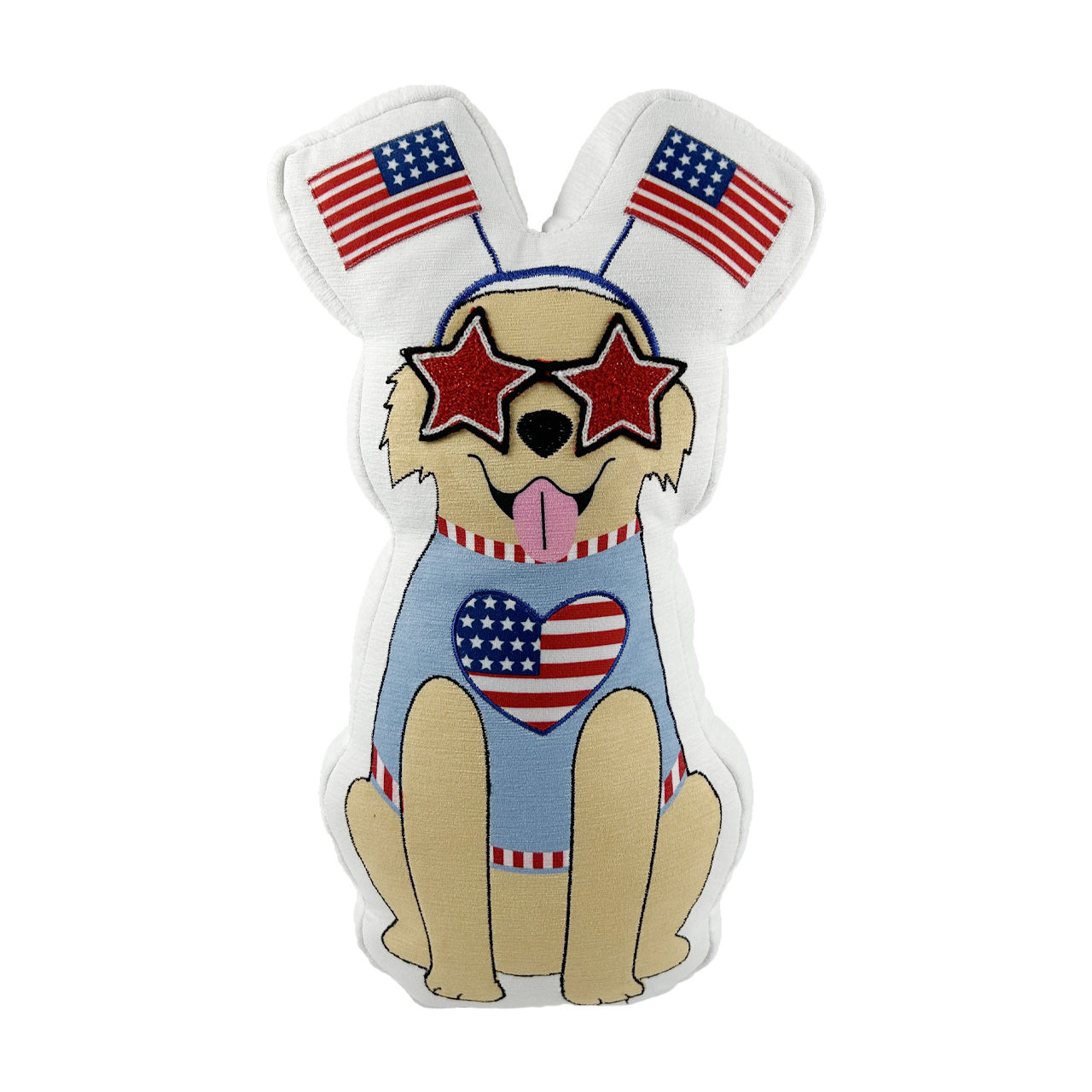 The design showcases an endearing dog wearing a light blue shirt adorned with a heart-shaped American flag. Adding to the festive flair, the dog sports red star-shaped sunglasses and antenna headbands with mini American flags. The cheerful expression and bright colors make this pillow a delightful addition to any space, bringing a touch of whimsy and patriotism to your decor.