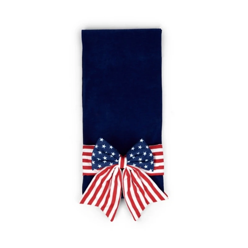 Set the scene for a fun 4th of July celebration with this Patriotic Flags & Stars Table Runner! Detailed with bows and scalloped accents, this seasonal table runner radiates Americana charm! Runner measures 90L x 14W in. Crafted of 100% polyester Features flag and bow patterns Scalloped edges Hues of white, red, and blue Care: Spot clean. Contact your local Kirkland's store for availability. Quantities and selection may vary by location.