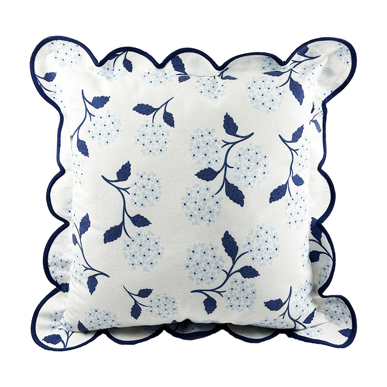 The pillow features a beautiful floral pattern in shades of blue, set against a crisp white background. The intricate design showcases clusters of delicate flowers and leaves, evoking a sense of timeless beauty and sophistication. The scalloped edges, highlighted with a coordinating blue trim, add an extra layer of detail and refinement, making this pillow a standout piece in any room.