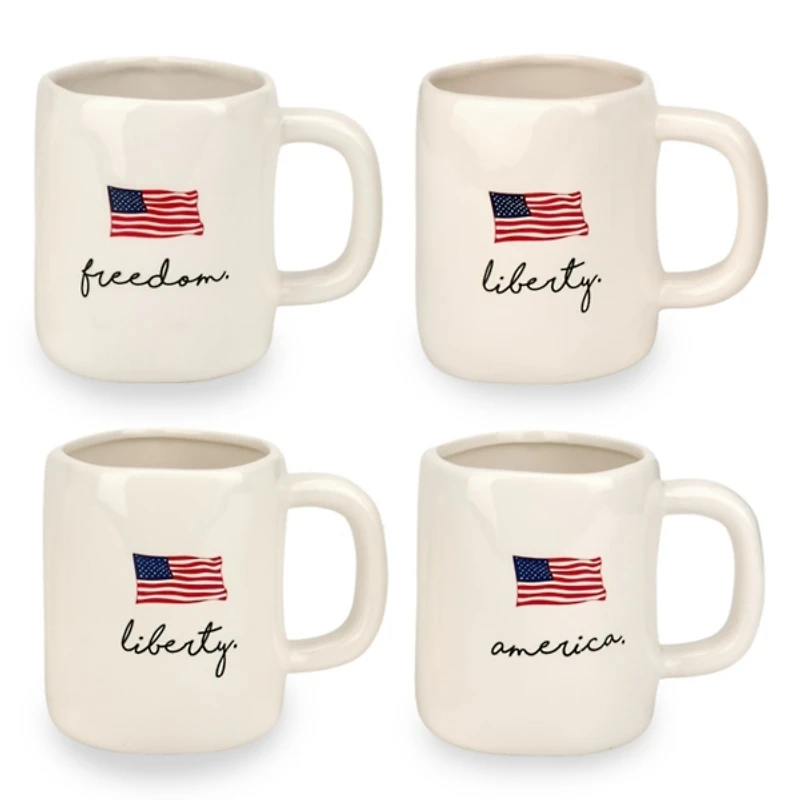 Our set of Patriotic Sentiment Mugs will add a heartfelt touch to your 4th of July gathering. Their organic shapes and handwritten style create a cozy, artisanal look. Set includes four (4) mugs Each mug measures 5.75L x 4.25W x 4.75H in. Holds up to 28.5 oz. each Crafted of 100% dolomite American flag designs Features the text "home. freedom. america. liberty." Organic shapes Hues of white, red, blue, and black Food and microwave safe Care: Dishwasher safe. Contact your local Kirkland's store for availability. Quantities and selection may vary by location.