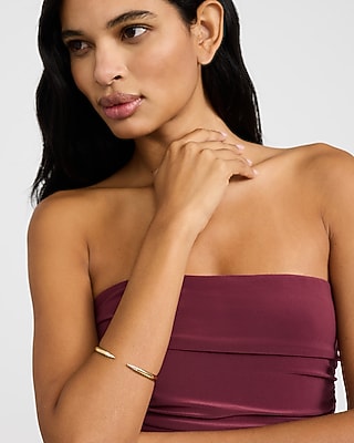 The perfect addition to any outfit, this gold bangle is complete with pave rhinestones and a hinge closure for easy wear. Style over the sleeve of your favorite shirt or dress up your favorite tee.