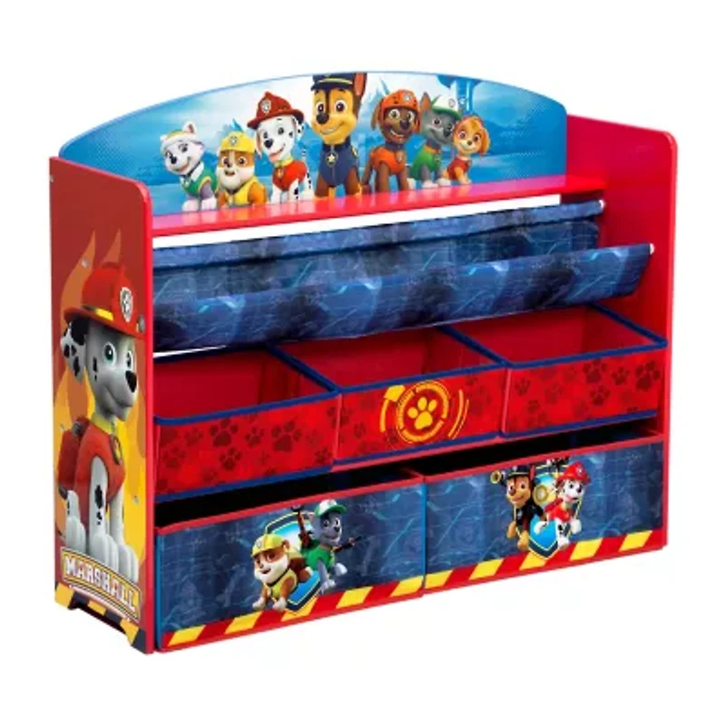 Make any bedroom or play space ready for any adventure with a little help from the paw patrol deluxe book & toy organizer. Boasting colorful graphics of their favorite pups, this handy book rack and toy storage solution features five storage bins plus a bookshelf to easily hold books and toys of all sizes.