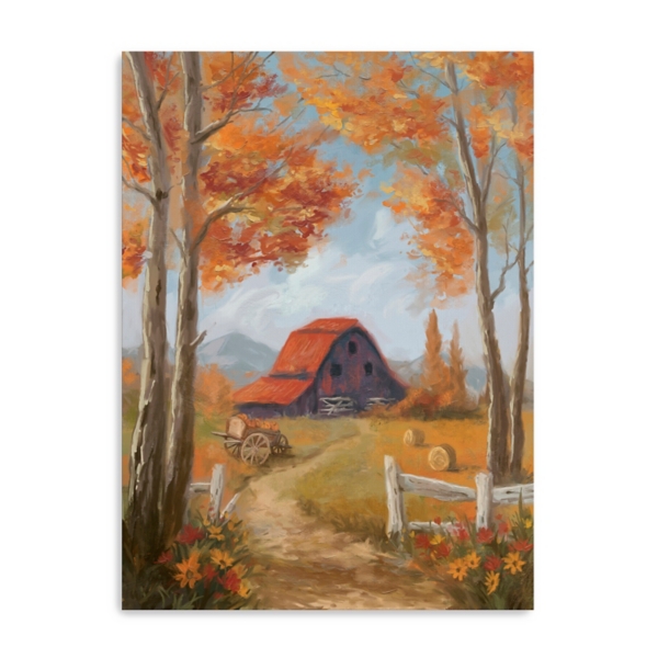 Admire the fall foliage of the countryside with this Peaceful Barn Canvas Art Print. This warm, autumnal scene will create an inviting feeling in your rustic farmhouse. Overall dimensions Width: 30 in. Depth: 1.25 in. Height: 40 in. Distinctively printed on stretched canvas Wrapped edges complete the look Features barn subject Hues of orange, brown, and green Artist: Gia Hoang Weight: 3.3 lbs. Hangs from back-mounted hardware Care: Dust with a soft, dry cloth. This item is available at Kirklands.com only, not available in stores. Please note: this item cannot be shipped to APO/FPO addresses.