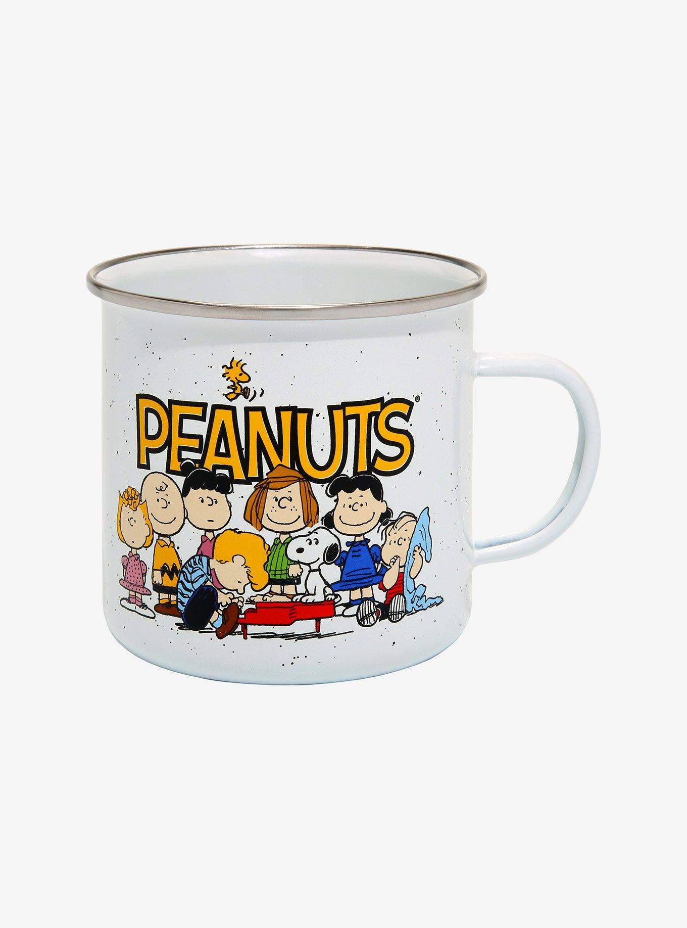 Wake up with the whole Peanuts gang! This speckled camper mug from features a character group design with logo above.