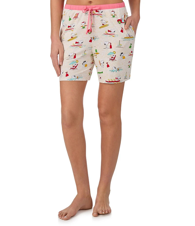 From Peanuts, this sleep boxers features: Jersey knit fabrication Snoopy beach print Elastic waistband Drawstring tie closure Side seam pockets Approx. 5.5" inseam Rayon/spandex Machine wash cold/tumble dry low Imported.