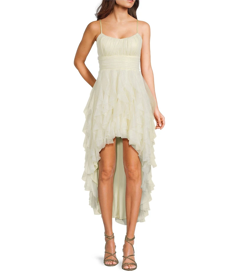 From Pear Culture, this dress features: Foiled mesh fabric Scoop neckline Sleeveless Spaghetti straps Shirred bodice High-low hem Corkscrew ruffled skirt Tie back with partial Zip back closure Approx. 44.5" center-back length Polyester; lined Hand wash/lay flat to dry Imported.