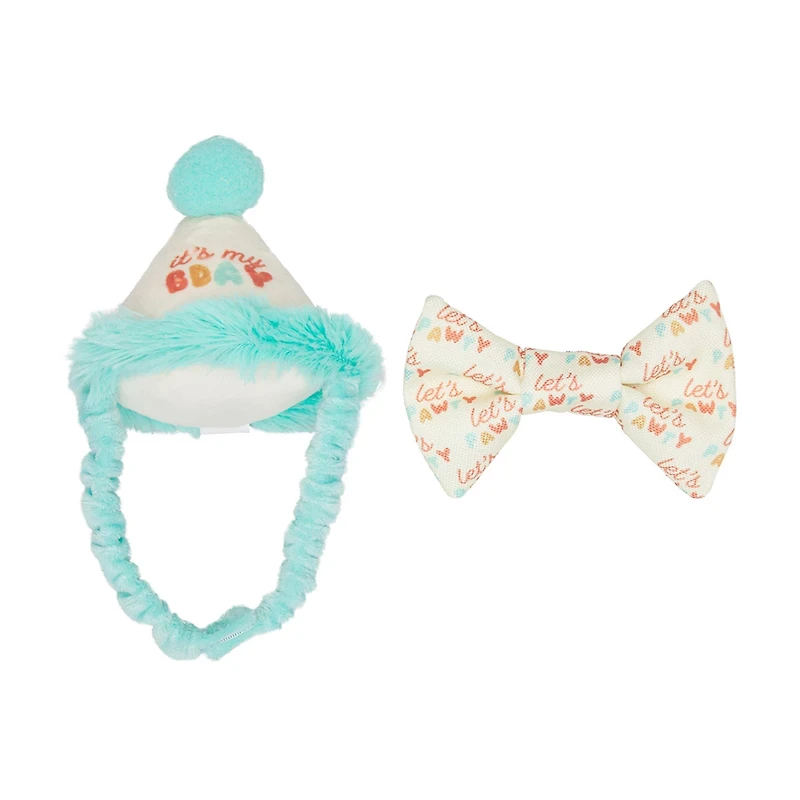 The set includes a charming birthday hat and a coordinating bowtie, each featuring playful designs that exude a festive vibe. The hat boasts a cheerful "It's my Bday" message in a fun, colorful font, topped with a cute pom-pom that adds a touch of whimsy. The hat's soft pastel blue color is accented with a fluffy trim that matches the elastic band, ensuring a comfortable fit for your pet.