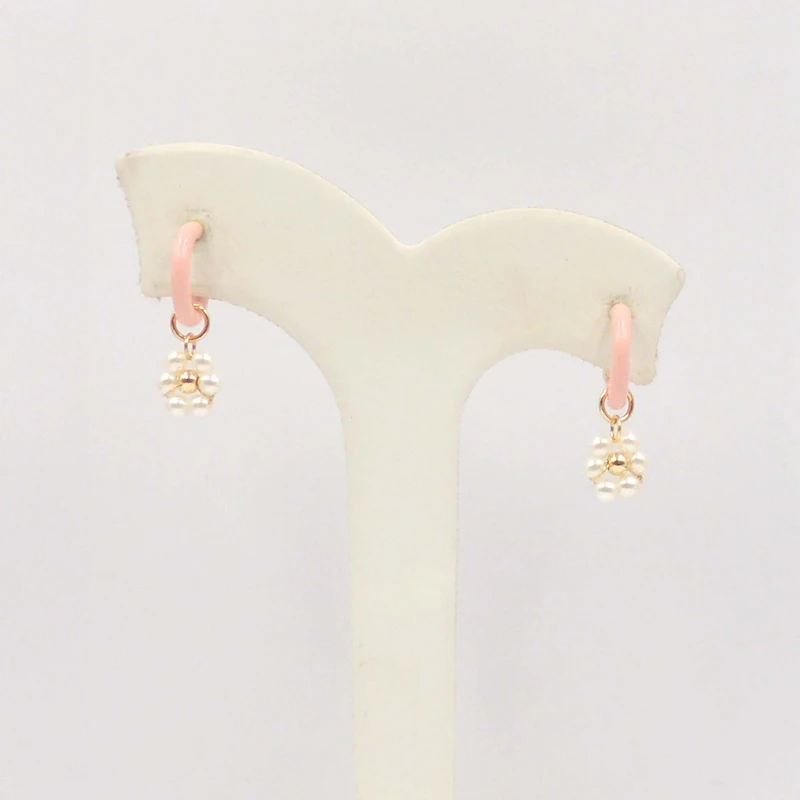 Shop enamel hoop earrings with pearl flower charms in pink. Lightweight, feminine, and perfect for everyday wear or special occasions.