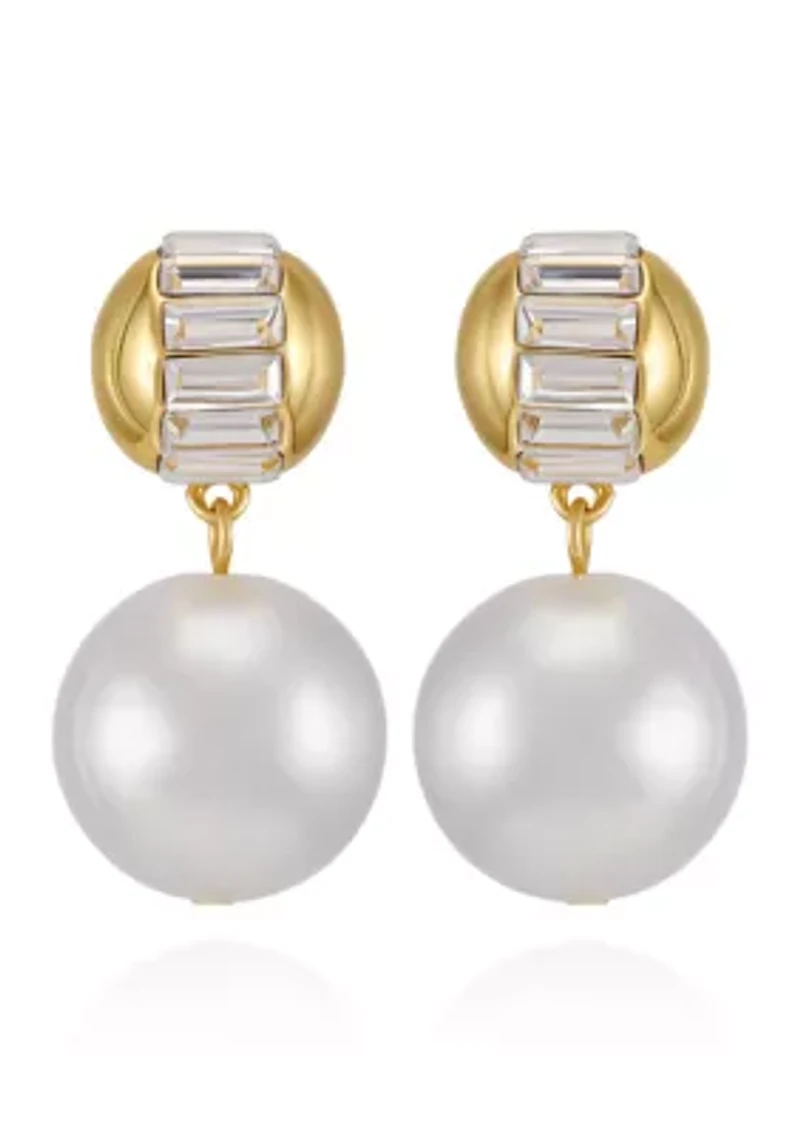 Elevate your look with these elegant drop earrings, designed for women who appreciate timeless style. Crafted from lustrous metal, these Vince Camuto earrings feature a delicate pearl drop accented with sparkling baguette details. They offer a perfect balance of sophistication and wearability. The secure post-back closure ensures comfortable all-day wear. Add a touch of glamour to any outfit and effortlessly enhance your natural beauty. Post back earrings Imported Product Specifications 1.5" L x 0.8" W Material & Care Gold-tone metal, silver-tone metal Clean with a soft cloth