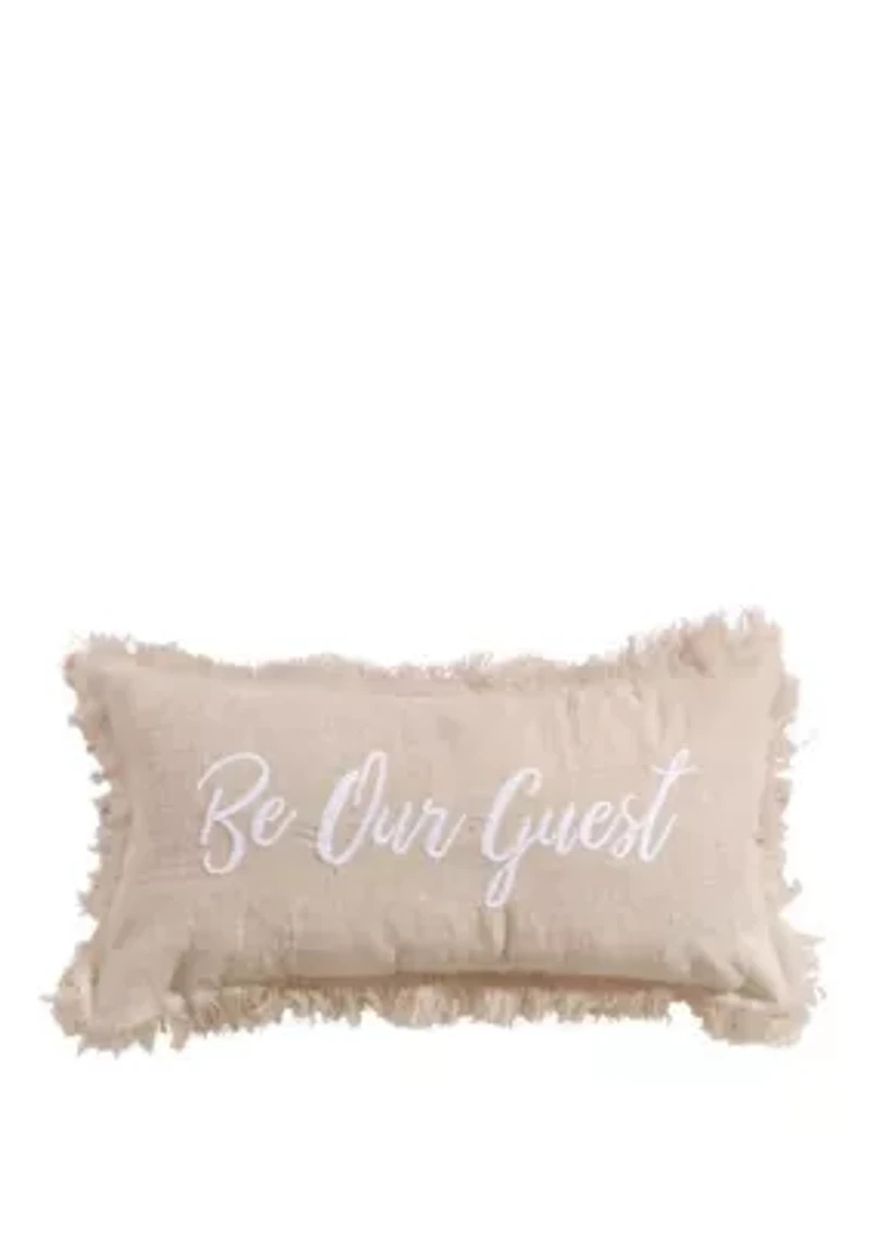 The Levtex Home Pembroke Spa Be Our Guest Pillow features embroidery in white on a fringed natural ground to invoke relaxing energy in your space. This 12-inch x 24-inch pillow has a machine washable shell, is made of blended linen cotton and includes a duck feather insert. Novelty pattern Imported Product Specifications 12 in W x 24 in L Material & Care Cotton Machine washable