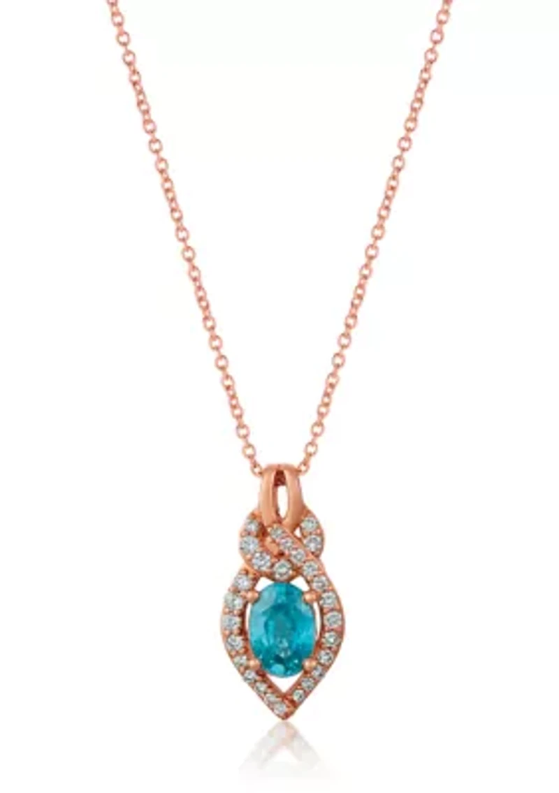 Adorn your neckline with this Le Vian® pendant, a testament to timeless elegance. Crafted from radiant rose gold, this piece showcases a captivating oval-cut blue zircon, complemented by a delicate halo of shimmering vanilla diamonds. The polished finish enhances the brilliance of the stones, creating a dazzling display of light. Lobster closure 27 vanilla diamonds, 1 blue zircon Polished finish Prong setting Warranty available Imported Product Specifications 18" L Material & Care 14K Strawberry Gold® Clean with a soft cloth