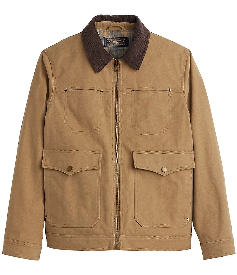 From Pendleton, this jacket features: Corduroy collar Full-zip closure Long sleeves with adjustable cuffs Two open chest pockets Two lower pockets with snap flap closure Secure inside pockets Straight hem Stitching detail Upper back is lined with wool-blend Cotton canvas Machine wash Imported.