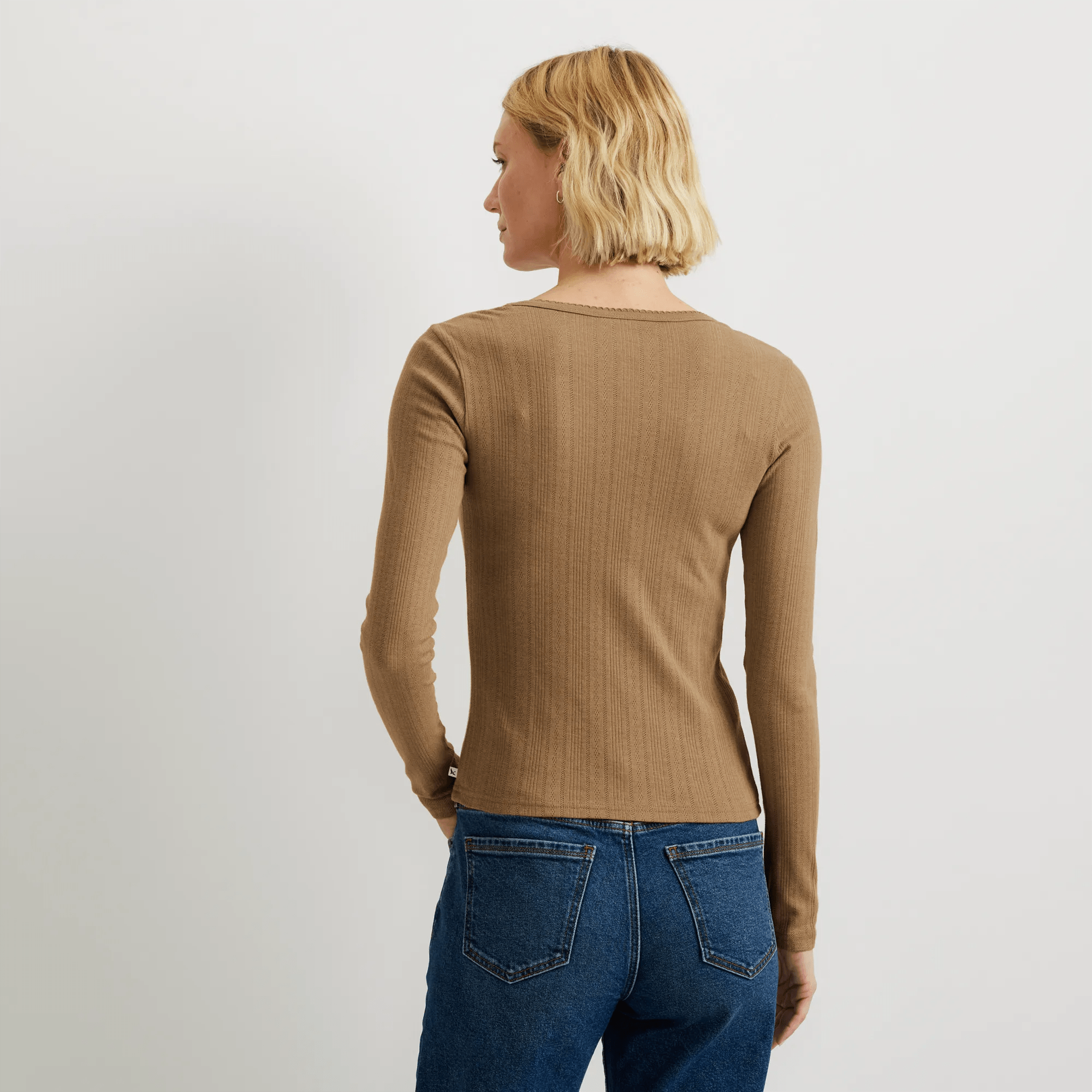 From crisp morning hikes to cozy couch hangs, this pointelle shirt brings a little texture to every fall moment. Layering it under a flannel shirt or down vest adds a feminine touch.