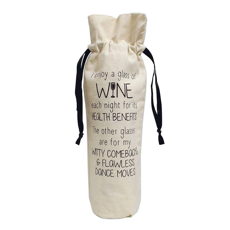 This festive canvas wine bag makes a perfect holiday gift. This wine bag fits a standard sized 750ml wine bottle, as well as most burgundy and champagne bottles. This bag includes a clearly printed quote on the front. They are perfect for parties, weddings, anniversaries, showers, housewarmings, holidays, and other celebrations.