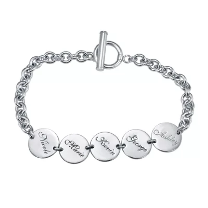 Mom will keep a thoughtful reminder of her loved ones close at hand every time she wears this disk bracelet. Each disk is personalized with up to seven script letters.