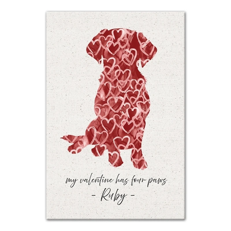 The Personalized Four Paws Valentine Canvas Art Print is perfect for any dog lover! You'll love hanging it above your entryway table or desk for the Valentine's Day season. Overall dimensions Width: 18 in. Depth: 1.25 in. Height: 12 in. Distinctively printed on stretched canvas Wrapped edges complete the look Features the phrase: "My valentine has four paws" Silhouette of a dog filled with hearts design Includes a space for personalized text Hues of white, red, pink, and black Designed and printed in the USA Weight: 1.81 lbs. Hangs from back-mounted hardware Care: Dust with a soft, dry cloth. This item is available at Kirklands.com only, not available in stores. Please note: this item cannot be shipped to APO/FPO addresses.