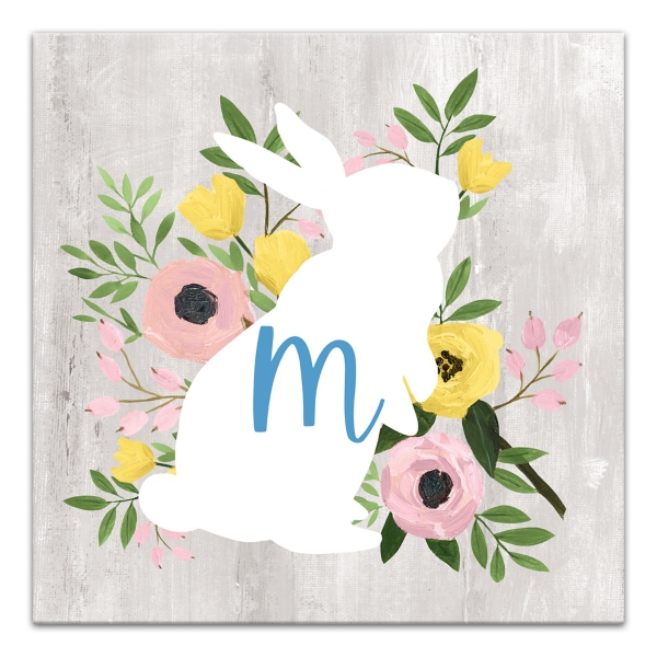 Put a pop of spring on your walls with this Personalized Monogram Bunny Canvas Art Print. It will add a cute, custom flair to your Easter decorations! Art measures 16L x 1.25W x 16H in. Distinctively printed on stretched canvas Uses custom-developed, archival pigment based inks Wrapped edges complete the look Features a bunny with floral accents Includes space for personalized monogram Hues of gray, white, green, pink, yellow, black and blue Weight: 1.45 lbs. Hangs from back-mounted hardware Designed and printed in the USA Care: Dust with a soft, dry cloth. This item is available at Kirklands.com only, not available in stores. Please note: this item cannot be shipped to APO/FPO addresses.